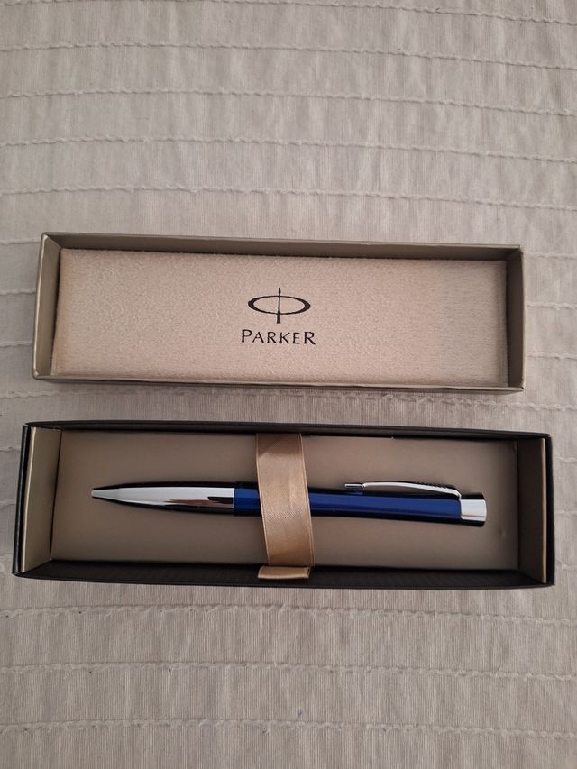 Bolígrafo de la marca Parker en color azul, presentado en su caja original. - Diseño elegante y moderno. - Incluye cinta de sujeción en la caja.