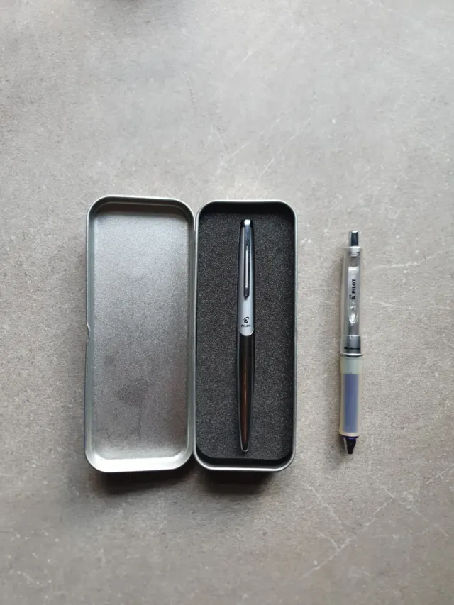 Detalles del productoBolígrafo de la marca Pilot, presentado en su estuche metálico.
