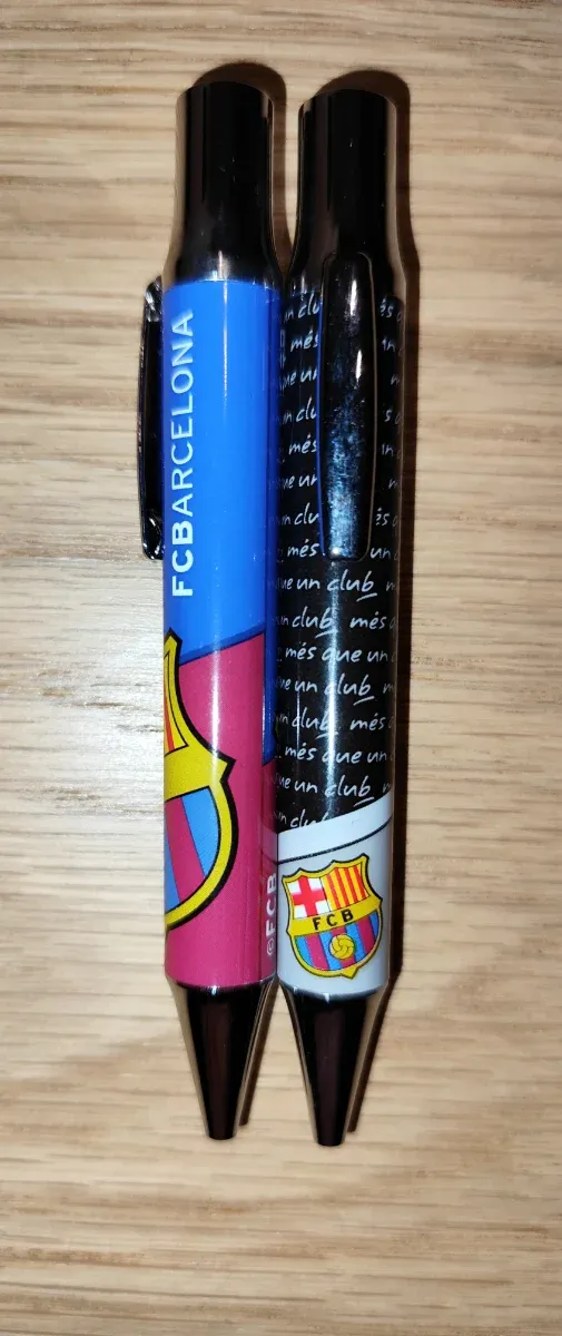 Detalles del productoDos bolígrafos con el escudo y los colores del FC Barcelona. Uno de ellos tiene el texto FCBARCELONA y el otro Més que un club.