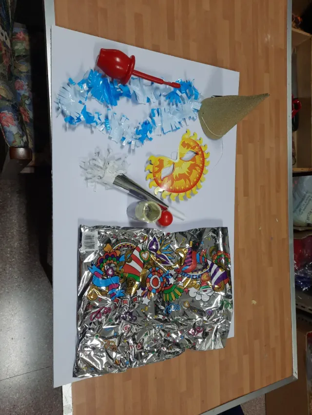 Set de cotillón para celebrar el fin de año. - Incluye máscara. - Serpentinas y adornos. - Cono dorado. - Bolsa plateada con diseño festivo.