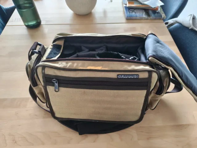 Bolsa de cámara estilo retro de la marca Cullmann. Un accesorio práctico y con un diseño clásico. - Color beige. - Compartimentos acolchados.
