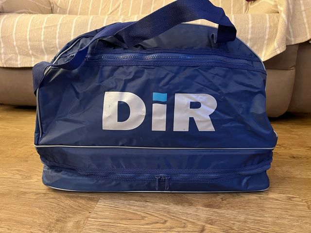 Bolsa de deporte de color azul marino con el logo de DIR. Es grande.