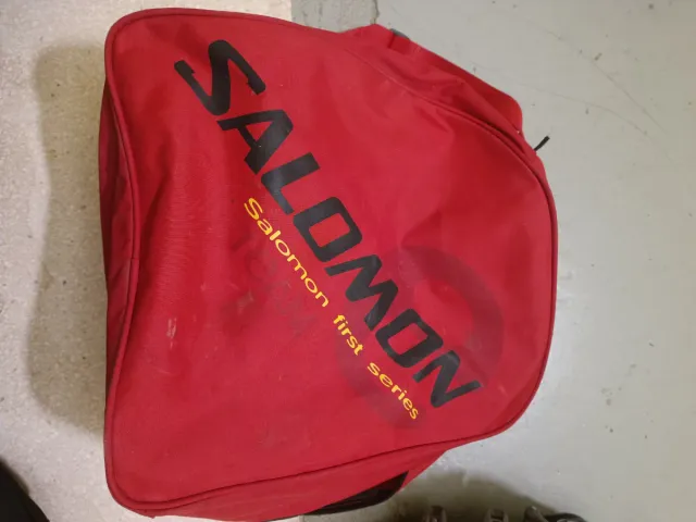 Bolsa de transporte para botas de esquí de la marca Salomon. - Color rojo. - Diseño con el logo de Salomon y first series en negro y amarillo.