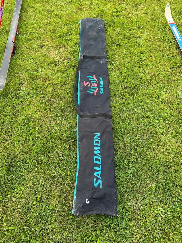 Bolsa de esquí de la marca Salomon. - Color negro con detalles en turquesa. - Logo de Salomon visible.