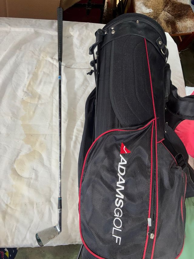 Se vende bolsa de golf Adams Golf junto con un palo. - Bolsa de golf negra con detalles rojos. - Palo de golf con mango texturizado.