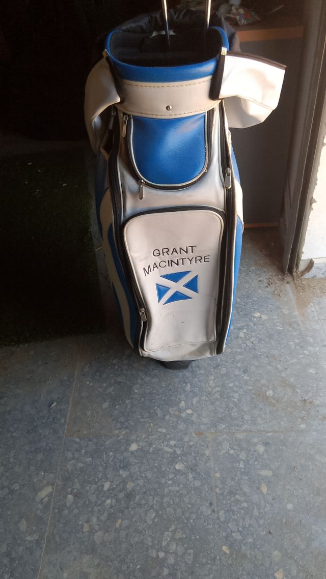 Bolsa de golf con diseño bicolor en blanco y azul. - Compartimentos para palos. - Bolsillos con cremallera. - Bandera de Escocia en el frontal.