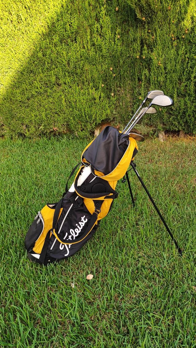 Conjunto de bolsa de golf Titleist con palos. Dos maderas 3 (Stiletto II y PG Turbo). Un driver H.R.G de 9°. Un lob wedge de 60° para juego corto.