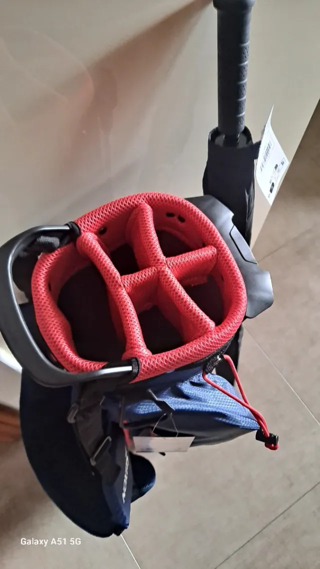 Conjunto de bolsa de golf y paraguas, ambos a estrenar. - Bolsa de golf con divisores interiores. - Paraguas negro con mango ergonómico.