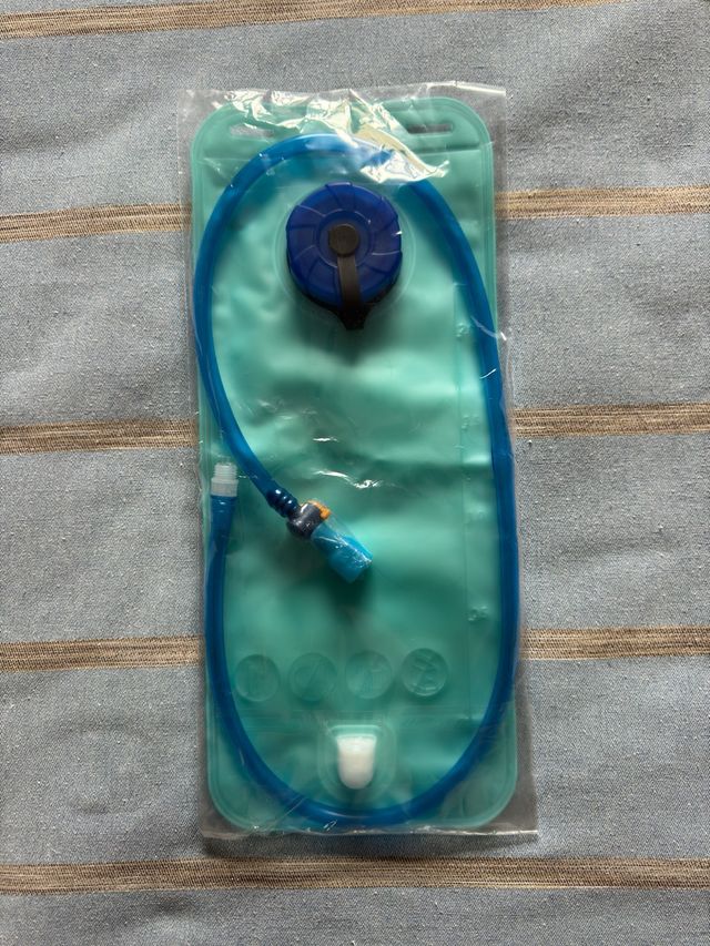 Bolsa de hidratación con capacidad de 2 litros, ideal para actividades al aire libre. - Color turquesa. - Tubo de bebida azul. - Boquilla de fácil acceso.
