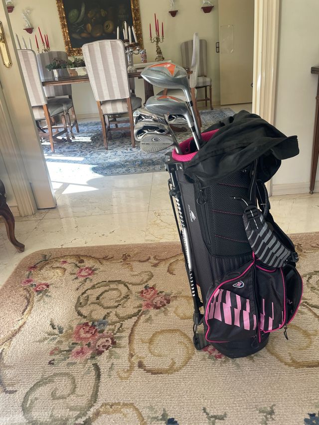Detalles del productoBolsa de palos de golf diseñada para niñas, con un llamativo color rosa y negro.