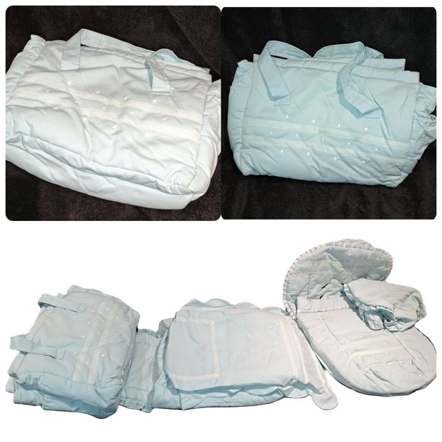Bolsa de piqué azul celeste. Se vende sola o el conjunto de saco de capazo, saco de grupo 0 y la bolsa.El conjunto vale 30€.No se hacen envíos, se entrega en mano.