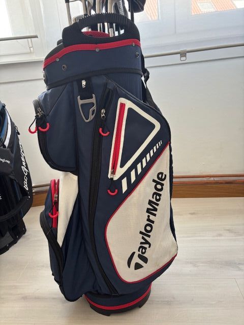 Detalles del productoBolsa palos golf taylormade para carrito. Tiene 7 bolsillos y 14 compartimentos para los palos de golf y 1 adicional para el putter. Utilizada muy poco tiempo.