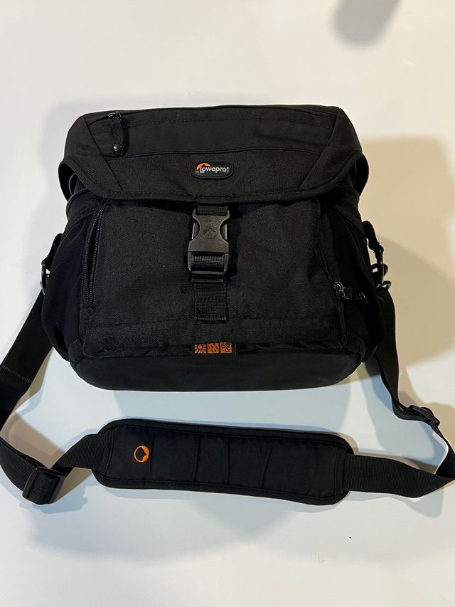 Detalles del productoBolsa negra de la marca LowePro, ideal para transportar equipo de fotografía.