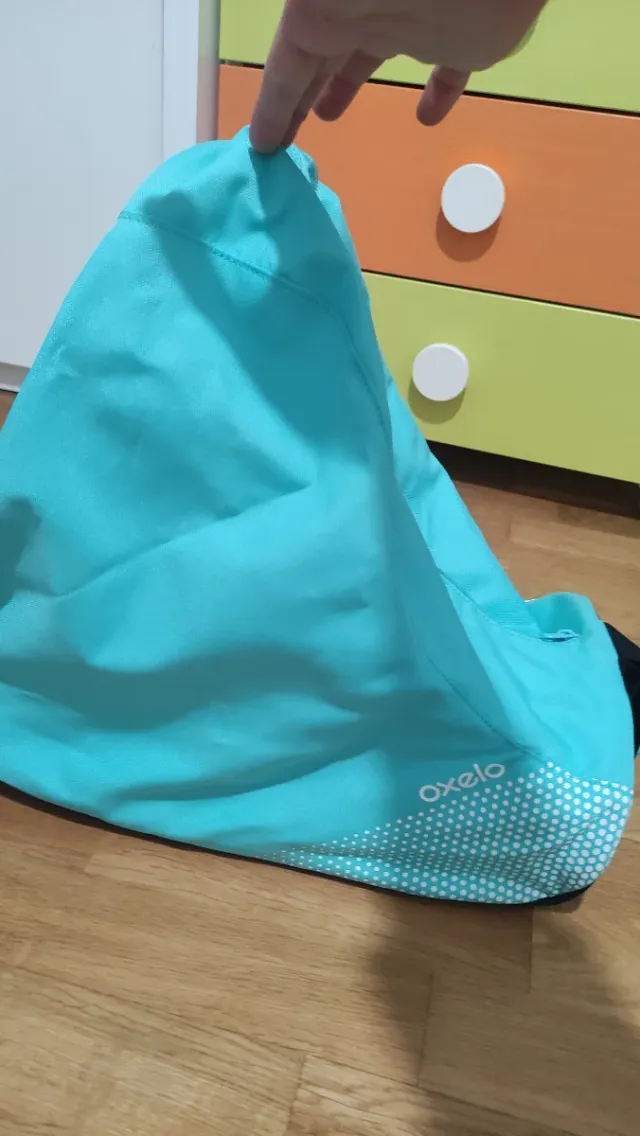 Detalles del productoBolsa de color turquesa con detalles de puntos blancos y el logo de Oxelo.