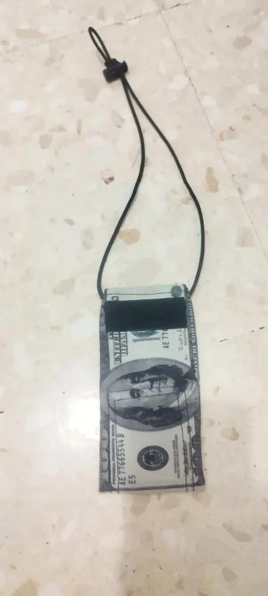 Detalles del productobolsa con diseño de billete de dólar, ideal para speedsoft. Se sujeta con un cordón ajustable.