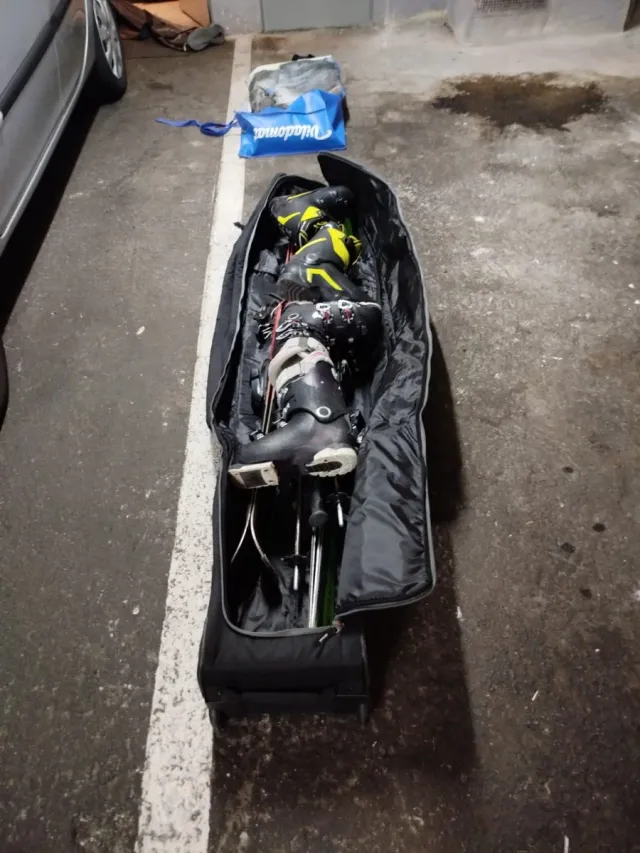 BOLSA PORTA ESQUÍS: Está bolsa tiene capacidad para llevar hasta cuatro pares de esquís o llevar dos pares de esquís, dos pares de botas, cascos. etc. La bolsa está homologada para facturar como material deportivo en avión, con las ruedas es muy fácil de llevar y está nueva y solo se utilizó una vez.