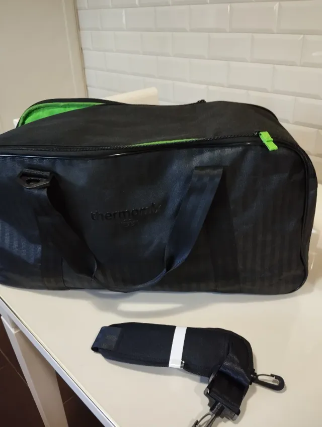 Bolsa de transporte para Thermomix TM7. Diseñada para proteger y facilitar su traslado. - Color negro con detalles en verde. - Asas de mano y correa ajustable para hombro.