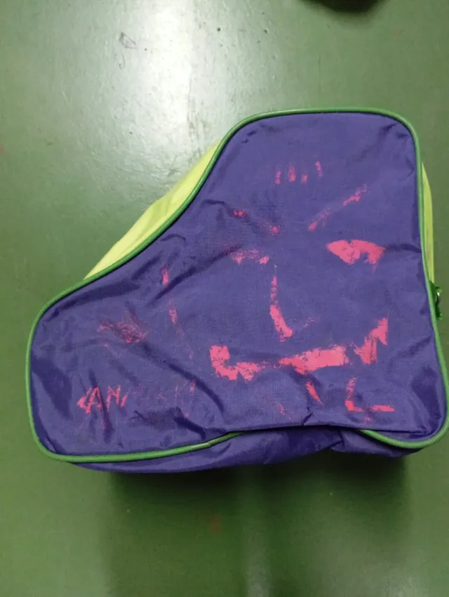 Bolsa de transporte para patines infantiles. Es de color morado con ribetes verdes y tiene algunas manchas rosas. - Diseño en forma de bota. - Cierre de cremallera.