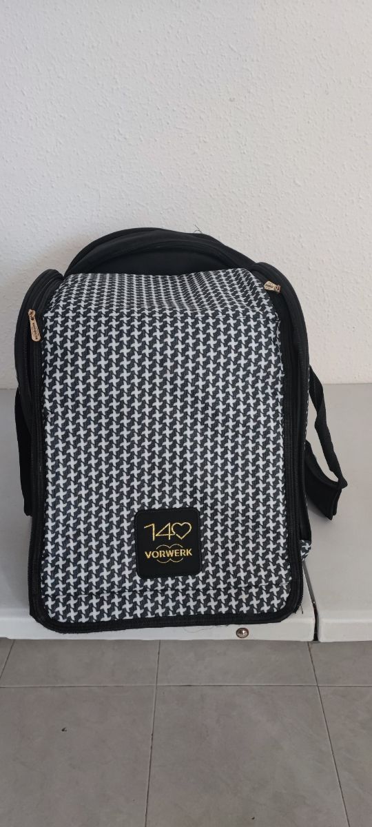 Bolsa de transporte para Thermomix TM6, en buen estado. - Diseño elegante en blanco y negro. - Asa de transporte cómoda. - Cremallera funcional.