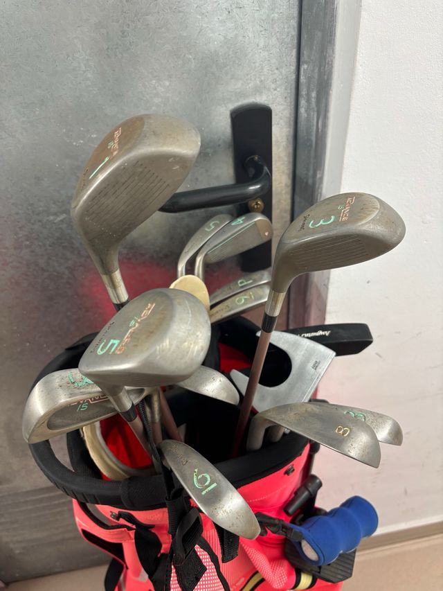 Set de palos de golf y bolsa. - Bolsa de golf de color rosa. - Incluye varios palos de golf con números visibles (1, 3, 5, 6, 8, 9). - Mango de goma