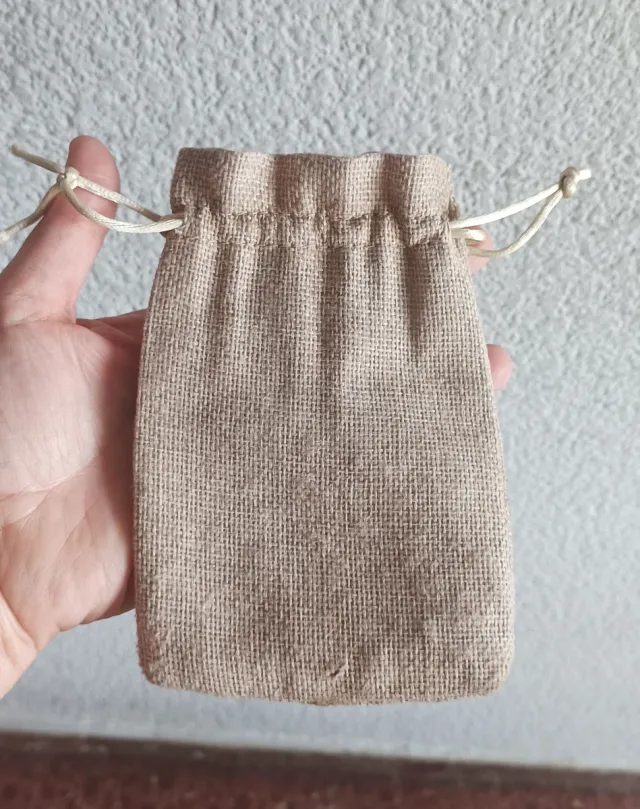 Pequeña bolsita de yute con cierre de cordón ajustable.