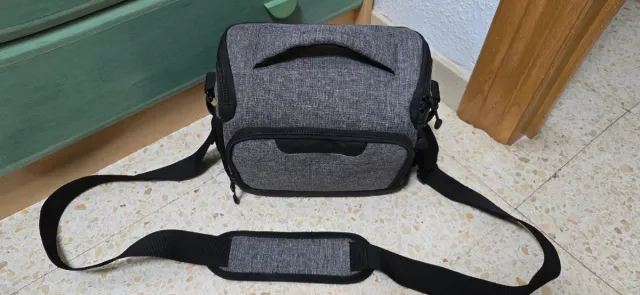Detalles del productoBolso bandolera de color gris, diseñado para transportar equipo fotográfico.