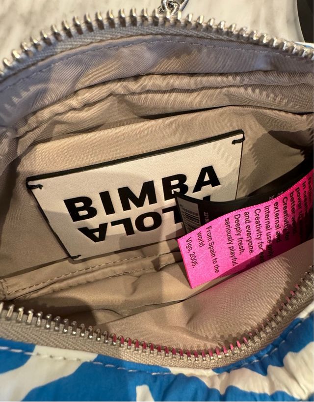 Detalles del productoBolso estampado de nylon Bimba y Lola. Cierre con cremallera. Asa bandolera de piel y cadena. Bolsillo interior. Exterior personalizado con logo de la marca en metálico. Nuevo. Nunca utilizado.
