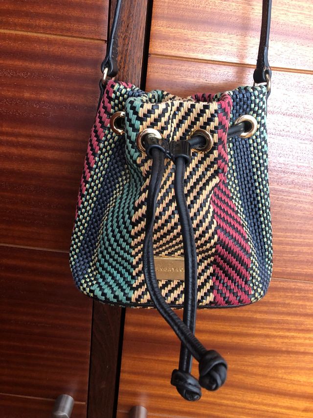 Bolso pequeño tipo saco de Bimba y Lola, tejido de piel y tela. Tiene su bolsa de tela original para guardarlo.