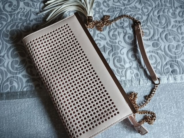 Detalles del productoprecioso y elegante bolso cartera suiteblanco color rosa maquillaje con cadena para colgar que se puede quitar. está impecable, lo he usado en una comunión. mide 28cm de largo por 15cm de alto.