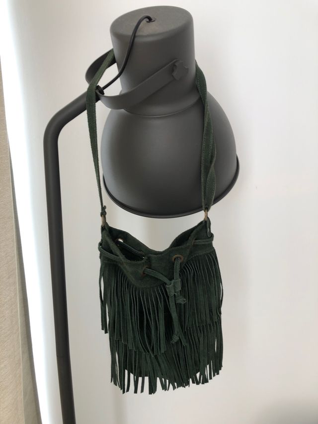 Bolso tipo saco con flecos verde de ante. Está como nuevo. 👉🏻 MÁS BOLSOS EN MI PERFIL!