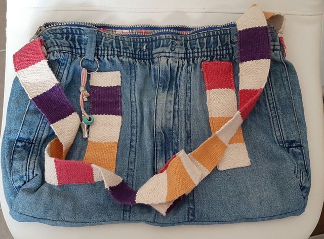 Hecho a partir de un pantalón tejano. Está forrado y lleva cremallera. 39x27 cms