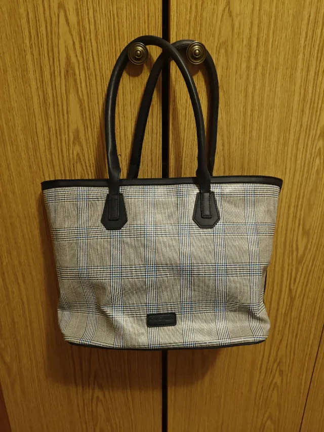 Bolso de cuadros gris y azul, bolso negro de cuero