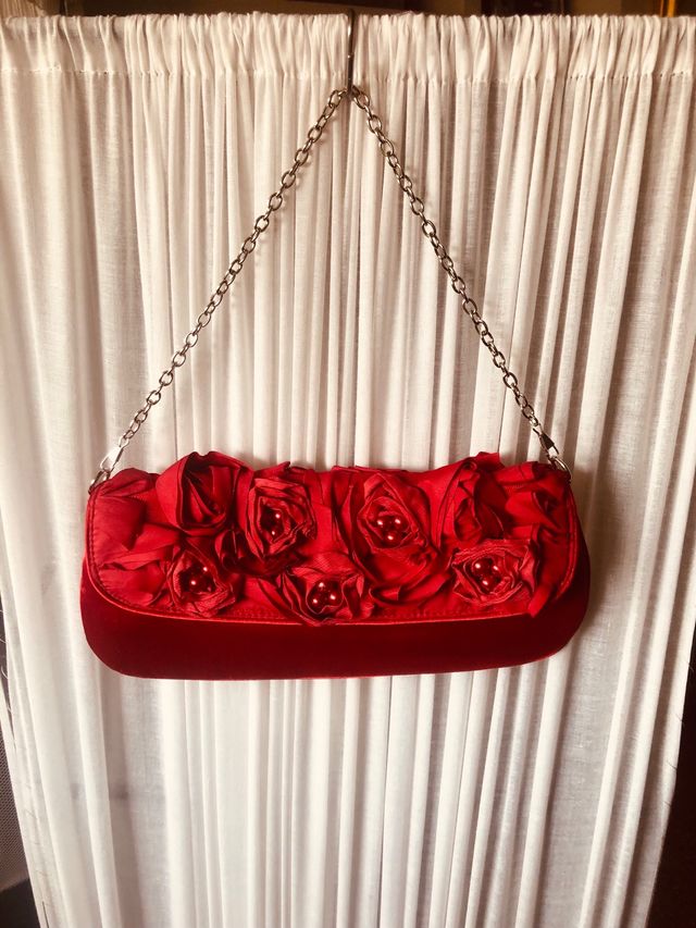 Detalles del productoCartera de fiesta sin estrenar, en raso color rojo y con adorno de flores y perlas. Se puede llevar con o sin cadena. Está muy rebajado porque lleva una pequeña mancha en una esquina por detrás, que apenas se ve.