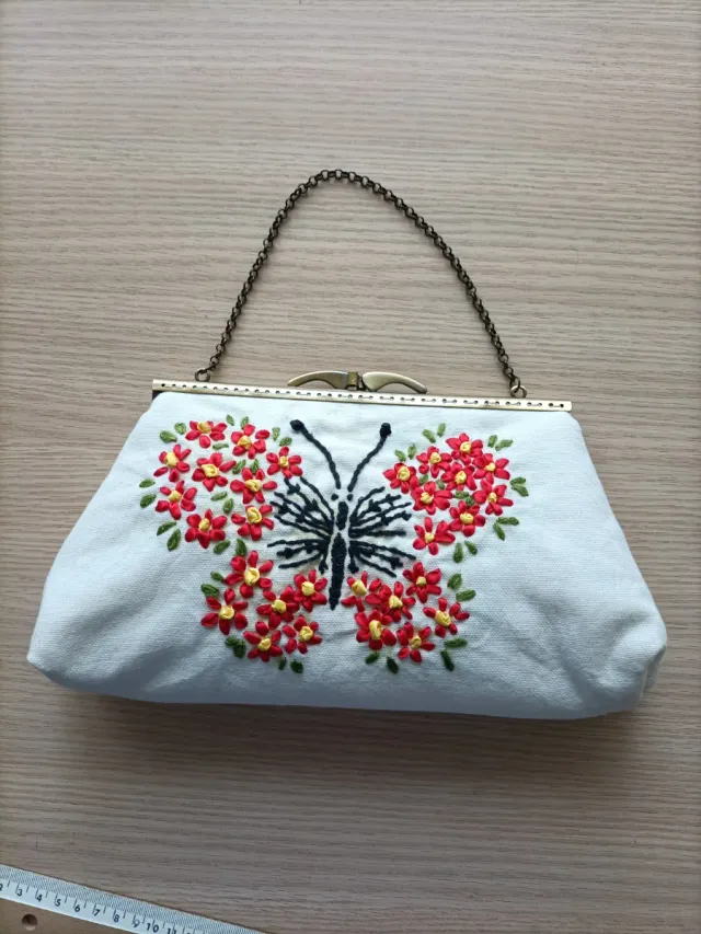 Bolso de mano con un bonito bordado de mariposa y flores.