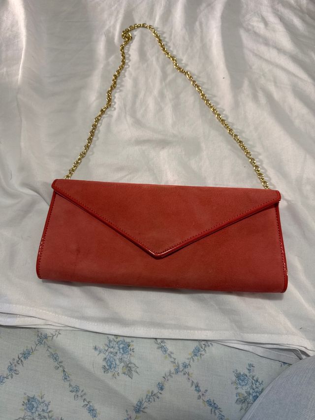 Elegante bolso de mano con un diseño tipo sobre. Perfecto para complementar tu atuendo. - Acabado en ante. - Detalle de cadena dorada. - Cierre de solapa.