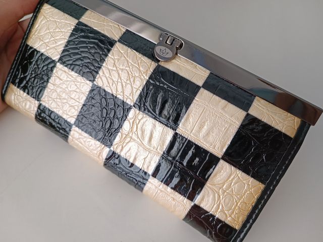Bolso de mano plano. A estrenar. Estampado de cuadros y acabado brillante. Imitación piel. Con varios compartimentos.