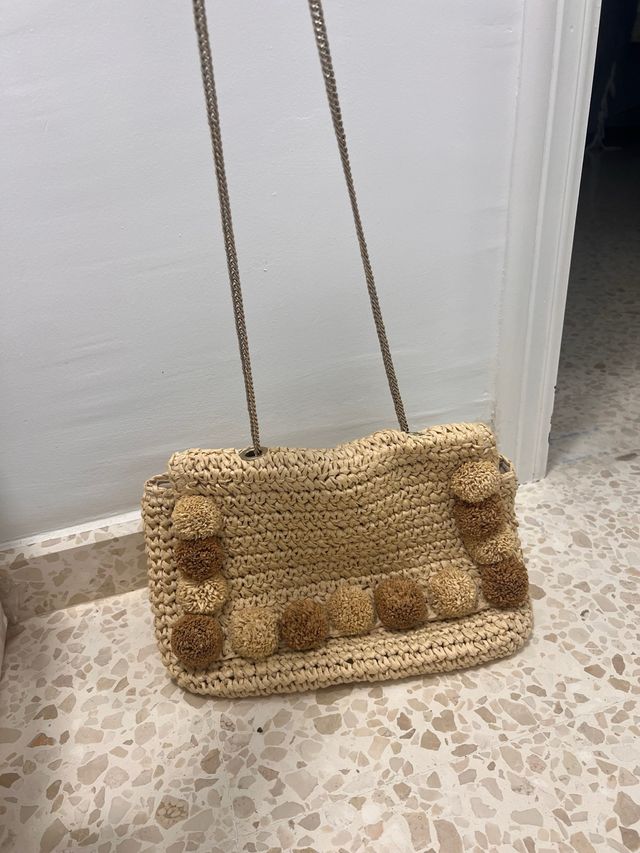 Bolso de rafia con pompones