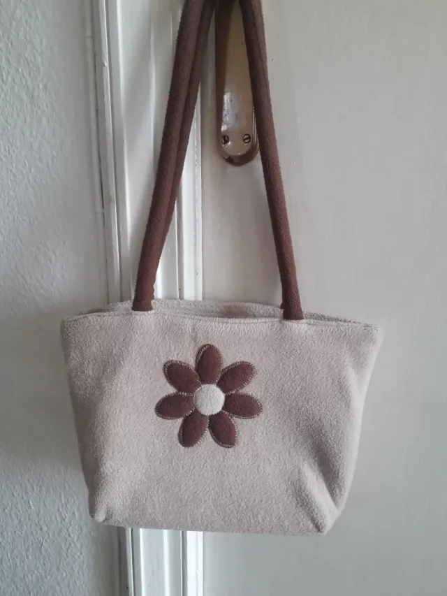 Bolso de tela beige con flor marrón