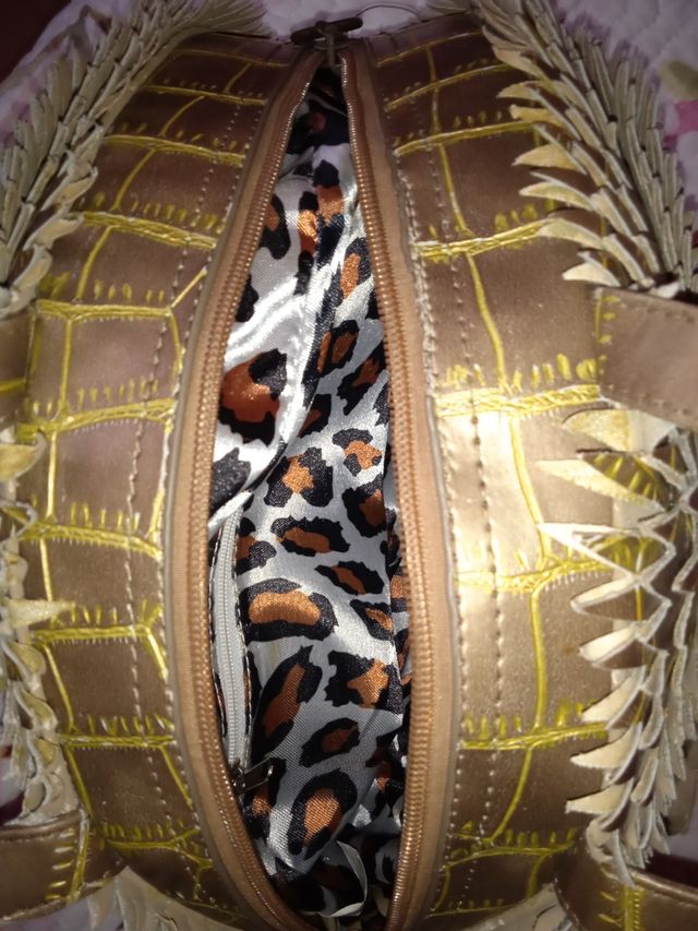 Detalles del productoBolso de erizo 3D de mano en dos tonos dorados mate. El interior con forro de leopardo con dos bolsillos interiores (pequeño y de cremallera). Muy buen estado, casi impecable. Tu bolso original, de diseño, elegante y al mismo tiempo divertido. Puede ser un adorno ideal cuando no lo utilizas de bolso.
