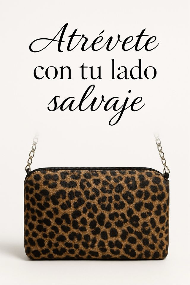 Bolso con un llamativo estampado de animal print. - Diseño rectangular. - Cadena metálica para llevar al hombro.