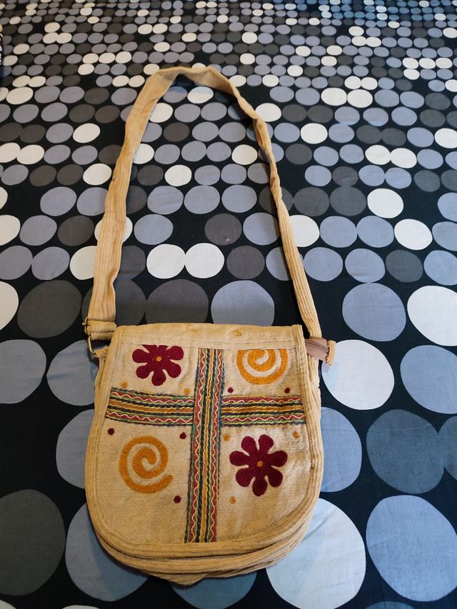 Detalles del productoBolso estampado de pana, para usarlo colgado al hombro o cruzado, asa regulable. Cremallera y bolsillo interior y bolsillo trasero con cremallera. Se cierra con velcro. En buen estado, tiene alguna bolita del roce con la ropa en la parte trasera.