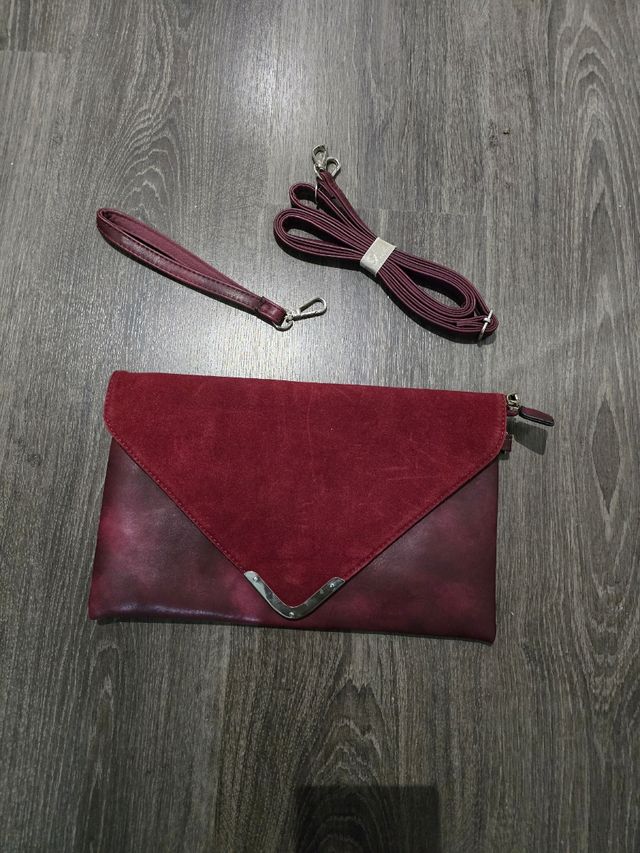 Bolso fiesta o evento. Color burdeos. Cierre frontal con broches y cierre interior con cremallera. Dos separadores. Posibilidad de añadir correa y asa.