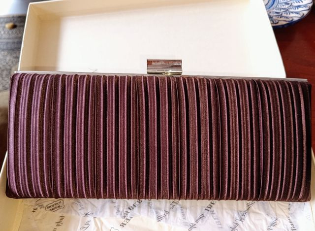 Bolso de fiesta muy elegante, a estrenar. Drapeado Marrón chocolate ,cadena y cierre en paleteado. Su precio en la tienda 49,95€.