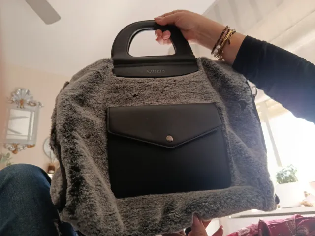 Bolso Hispanitas reversible con un lado de pelo gris y otro negro.