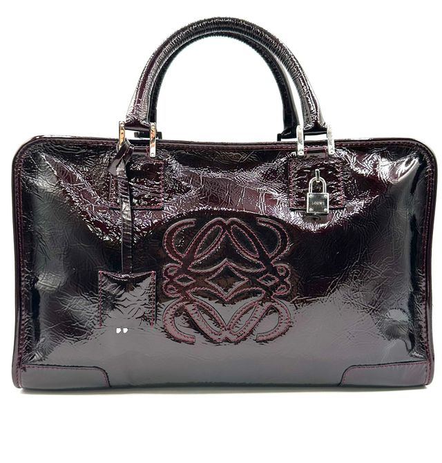 Detalles del productoBolso de mano LOEWE Amazona en charol burdeos con acabado arrugado de alto brillo, símbolo de la artesanía de lujo de la firma española. Este modelo icónico destaca por su diseño estructurado y elegante, ideal para combinar con estilos clásicos o contemporáneos. Lleva el anagrama de Loewe grabado en relieve, asas rígidas superiores y herrajes metálicos plateados, incluido un candado decorativo con la firma. Su base con pies metálicos protege la estructura, y el interior en lona de algodón marrón chocolate incluye placa metálica Loewe. Con medidas de 35 × 21 × 15 cm, está como nuevo, con caja y guardapolvo.
