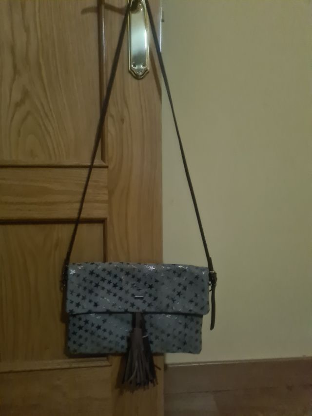 Gris y marrón. Con asa bandolera y posibilidad de quitar el asa y usar como bolso de mano.