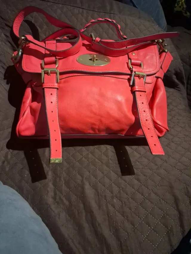 Bolso de piel en un vibrante color rojo, con detalles dorados. - Asa superior trenzada. - Cierre con giro metálico. - Correa ajustable para llevar al hombro.