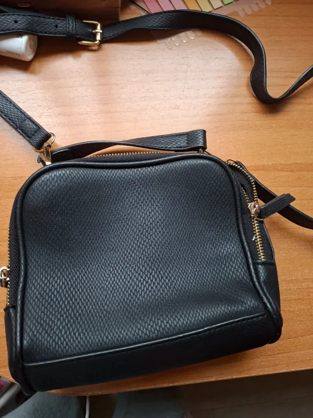 Bolso negro con textura. - Cierre de cremallera. - Correa ajustable que ademas se puede quitar. -Medidas aproximadas 20×16.