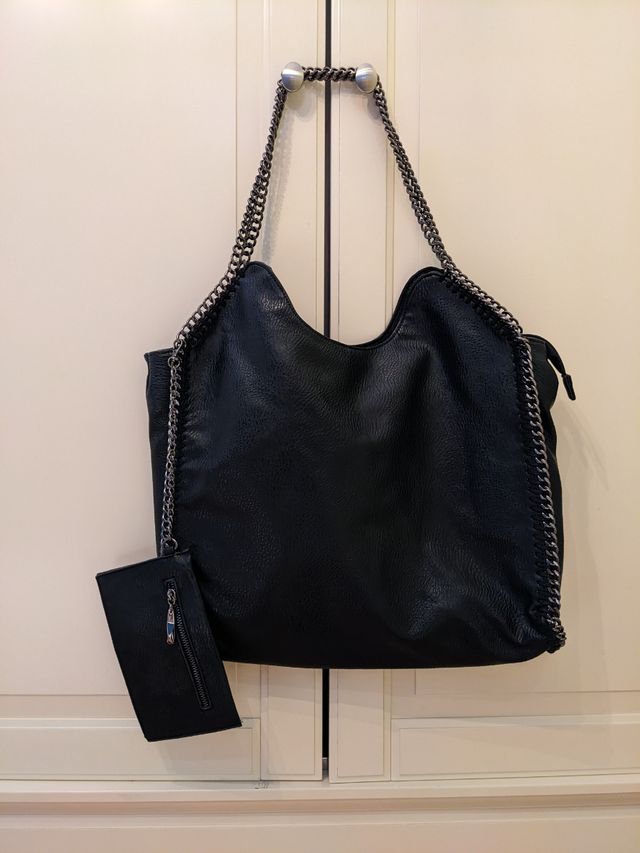 Detalles del productoBolso estilo Stella McCartney. Bolso grande de piel sintética con asas de cadena metálica. Tiene cierre imán y cremallera. Compattimento interior para móvil y bolsillo con cremallera. Pequeña cartera exterior que puede quitarse.