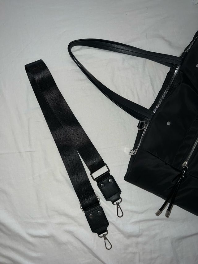 Bolso de Stradivarius en color negro. Cuenta con dos asas cortas y una correa larga ajustable.